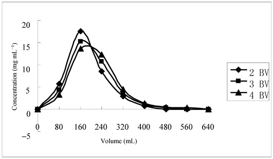 The flow rates investigated in this test were 2, 3 and 4 BV·h−1, and an ethanol-water solution (40%, v/v) was used to elute total flavonoids, with the results shown in Figure 4. Although the elution volume varied little with increasing the flow rate, total flavonoids were totally desorbed with 5 BV, 6 BV and 7 BV of elution volume at the flow rate of 2, 3 and 4 BV·h−1, respectively. Thus, 2 BV·h−1 was selected as the proper desorption flow rate in consideration of the lower volume consumption and high efficiency in the dynamic desorption experiments.
