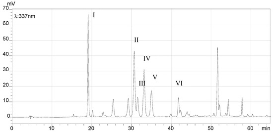 HPLC chromatogram of the crude flavonoid extracts (λ = 337 nm). The peaks were identified as chlorogenic acid (I), 2″-O-β-d-xylopyranosyl isoorientin (II), 6-C-α-l-arabipyranosyl orientin (III), orientin (IV), isoorientin (V), and vitexin (VI).