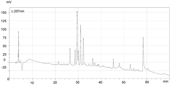 HPLC chromatogram of final products (λ = 207 nm). Comparing with Figure 7, the broad peak with a retention time of 55.47 min disappeared.