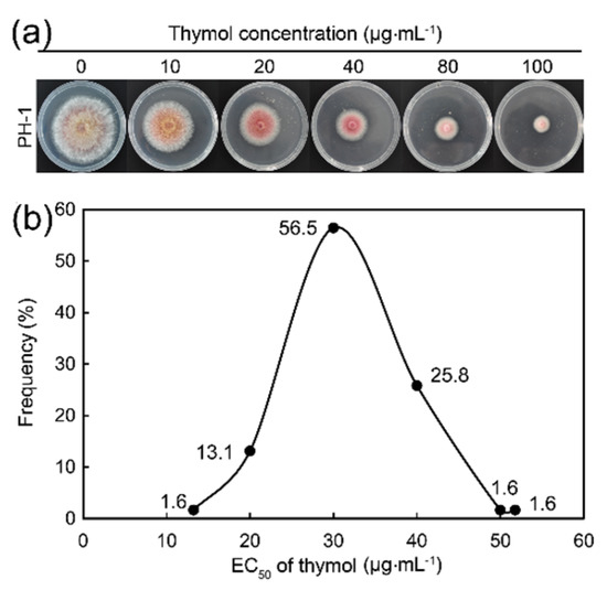 Effect of thymol on (a) standard strain PH-1 which is the model organism of F. graminearum and (b) other isolates of F. graminearum. (a) Strain PH-1 was cultivated on PDA plates containing thymol (0–100 μg·mL−1) for 3 days for photographing and the measurement of the diameter of colonies; (b) Distribution of thymol EC50 values for 59 F. graminearum isolates. A total of 59 F. graminearum isolates were cultured on PDA plates containing thymol (0–100 μg·mL−1) for 3 days for the measurement of the diameter of colonies. Thymol EC50 value for each isolate was calculated for the establishment of a baseline sensitivity curve. Each result was the mean of three replicates.