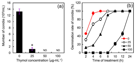Effect of thymol on (a) conidia production and (b) conidia germination of F. graminearum (PH-1). (a) Conidia were induced in MBB medium containing thymol (0, 25, 50, and 100 μg·mL−1) for 5 days. Then the conidia were counted under microscopy. (b) The produced conidia were cultured in YEPD medium containing thymol (0, 25, 50, and 100 μg·mL−1) up to 24 h. The germinated conidia were monitored for the calculation of germination rate. Vertical bars represent standard deviations of the mean (n = 3). Asterisk indicates that mean values are significantly different (p < 0.05) between the treatment and the control. ND: not detected.