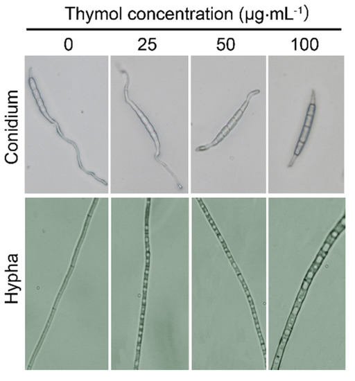 Effect of thymol on the morphology of conidium and hypha of F. graminearum (PH-1). The fresh conidia were treated with thymol at 0, 25, 50, and 100 μg·mL−1 for 24 h, respectively. Then the samples were visualized and photographed under light microscope.