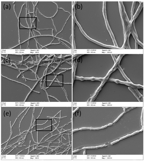SEM observation of the hyphal morphology of F. graminearum (PH-1) under thymol treatment. Hyphae were treated with thymol at (a,b) 0; (c,d) 25; and (e,f) 100 μg·mL−1 for 24 h. The micrographs were taken at the magnification of (a,c,e) 500× and (b,d,f) 2000×, respectively.