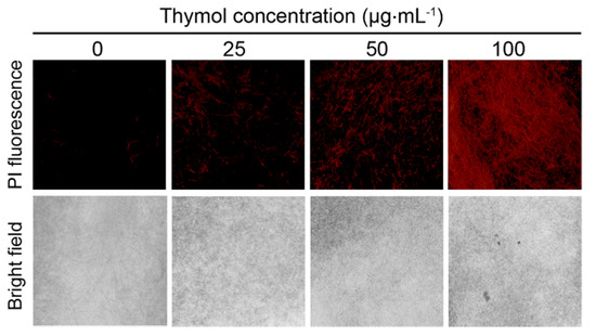 The cell membrane permeability was detected with a fluorescent probe (PI) that can only enter membrane-compromised cells to bind nucleic acids [24]. Fresh mycelia were treated with thymol at the ultimate concentration of 25, 50, or 100 μg·mL−1 for 24 h. Then, the mycelia were harvested and incubated in 2 μM of PI for 20 min, and rinsed with distilled water three times followed by the visualization (excitation 535 nm and emission 615 nm) by a fluorescence microscope (ECLIPSE, TE2000-S, Nikon Instruments Co., Ltd, Shanghai, China).