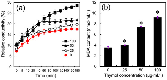 Effect of thymol on (a) the relative conductivity and (b) MDA content of the mycelia of F. graminearum (PH-1). Mycelia treated with thymol at 0, 25, 50, and 100 μg·mL−1 for 24 h were harvested for the measurements. Each value is presented as the average of three replicates. Asterisk indicates that mean values are significantly different (p < 0.05) between the treatment and the control.