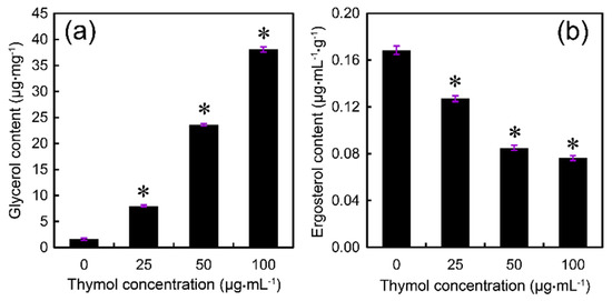 Electrolyte leakage resulting from cell membrane damage can trigger osmotic stress responses in fungi. It has been shown that intracellular glycerol plays an important role in the response of fungi to osmotic stress [26]. In the present study, we found that the glycerol content increased significantly in thymol-treated F. graminearum in a dose-dependent manner (Figure 7a), suggesting that glycerol accumulation could be induced by thymol in order to maintain osmotic balance. Ergosterol—the major sterol component of fungal cell membrane—is important for maintaining membrane integrity and cell function [27]. Compared to the control, treatment with thymol at 25, 50, and 100 μg·mL−1 resulted in a decrease in ergosterol content in F. graminearum by 25%, 50%, and 55%, respectively (Figure 7b).