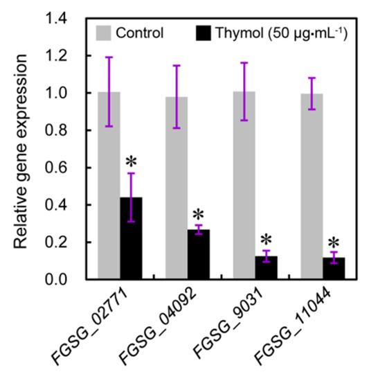 To test the effect of thymol treatment on the biosynthetic pathway of ergosterol in F. graminearum, we detected the expression of several genes related to ergosterol biosynthesis. FGSG_04092 indicates cyp51A encoding the cytochrome P450 sterol 14α-demethylase [28]. FGSG_02771, FGSG_09031, and FGSG_11044 are the homologues KES1 that are indispensable for the biosynthesis and distribution of ergosterol [29,30]. The results from quantitative reverse transcription-polymerase chain reaction (qRT-PCR) suggested that treatment with thymol at 50 μg·mL−1 for 24 h resulted in a significant decrease in the expression of four tested genes as compared to the control groups (Figure 8).