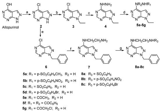 From commercially available allopurinol, compounds 2, 3, 4, 5a–5g, 6, 7 and 8a–8c were efficiently synthesized according to the synthetic route outlined in Scheme 1. Specifically, 4-chloro-1H-pyrazolo[3,4-d]pyrimidine (2) was obtained from the chlorination of allopurinol with POCl3. [] N-Ethylation and benzylation of 2 with bromoethane or benzyl bromide under alkali conditions gave 4-chloro-1-ethyl-1H-pyrazolo[3,4-d]pyrimidine (3) and 1-benzyl-4-chloro-1H-pyrazolo[3,4-d]pyrimidine (6), respectively. The reaction of 3 with NH2NH2 affords 1-ethyl-4-hydrazinyl-1H-pyrazolo[3,4-d]pyrimidine (4). Next, acylation reactions of 4 with 4-methylbenzene-1-sulfonyl chloride, 4-nitrobenzene-1-sulfonyl chloride, benzenesulfonyl chloride, 4-bromobenzene-1-sulfonyl chloride or acetylchloride, benzoyl chloride, and chloroacetyl chloride lead to compounds 5a–5g, respectively. The mono-N-arylation of ethane-1, 2-diamine by 6 resulted in the formation of N1-(1-benzyl-1H-pyrazolo[3,4-d]pyrimidin-4-yl)ethane-1,2-diamine (7). Finally, compounds 8a–8c were formed by the acylation of 7 with benzenesulfonyl chloride, 4-nitrobenzene-1-sulfonyl chloride and 4-bromobenzene-1-sulfonyl chloride, respectively.