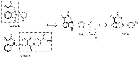In summary, this study reports the design, synthesis, and biological activity of novel 1H- thieno[3,4-d]imidazole-4-carboxamide derivatives as PARP-1 inhibitors. The preliminary enzymatic inhibitory activity of compounds 13a–j indicated that the large piperazine-containing side chains could not be tolerated in the thienoimidazole scaffold, but this also provided a basis for further designing PARP-1 inhibitors. The newly synthesized compounds 16a–n with short side chains displayed good enzymatic activities, and among them, 16l was the most potent one with activity comparable to olaparib. Cellular evaluations indicated that the anti-proliferative activity of 16g, 16i, 16j and 16l against BRCA-deficient cell lines was similar to that of olaparib, while the cytotoxicity of 16j and 16l toward human normal cells was lower. Furthermore, the ADMET prediction results indicated that these compounds might possess better toxic and pharmacokinetic properties. Further evaluation of the pharmacokinetic studies and anti-proliferative activities is on-going and will be reported in the near future.