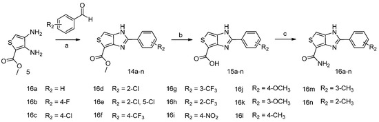 Synthesis of compounds 16a–n is shown in Scheme 2. Cyclization of the intermediate 5 with substituted benzaldehydes in the presence of iodobenzene diacetate provided intermediates 14a–n. Hydrolysis of esters 14a–o provided intermediates 15a–n. Lastly, ammonolysis furnished imidazo [3,4-d]thienocarboxamide derivatives 16a–n.