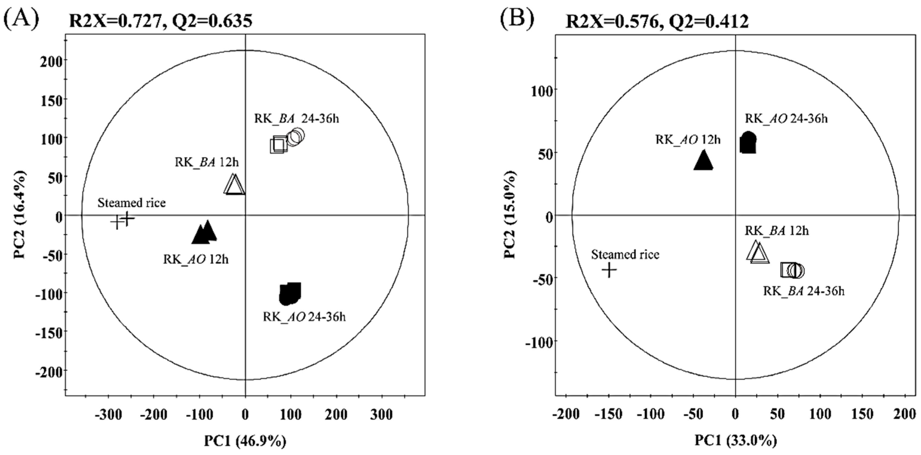 Principal component analysis (PCA) score plot for rice koji fermented with A. oryzae (RK_AO) or B. amyloliquefaciens (RK_BA) obtained by GC-TOF-MS (A) and UHPLC-LTQ-IT-MS/MS (B). (+, Steamed rice; unfilled symbols, RK_AO; filled symbols, RK_BA; △, ▲, 12 h; □, ■, 24 h; ○, ●, 36 h).