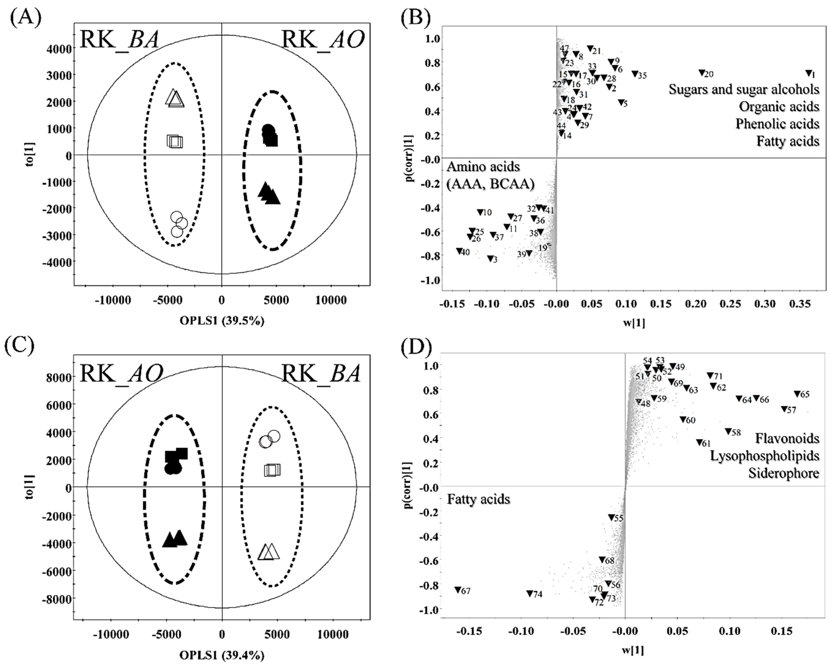 The OPLS-DA score plot (A,C) and loading S-plot (B,D) for rice koji fermented with A. oryzae (RK_AO) or B. amyloliquefaciens (RK_BA) obtained by GC-TOF-MS (A,B), and UHPLC-LTQ-IT-MS/MS (C,D). Highlighted metabolites (▼) in the S-plot indicate statistically significant differences between RK_AO and RK_BO (VIP > 1.0 and p < 0.05 in OPLS-DA). Each labeled peak number indicates a metabolite in Tables S1 and S2. The stated super-classes contain the identified metabolites (AAA, aromatic amino acid; BCAA, branched chain amino acid).