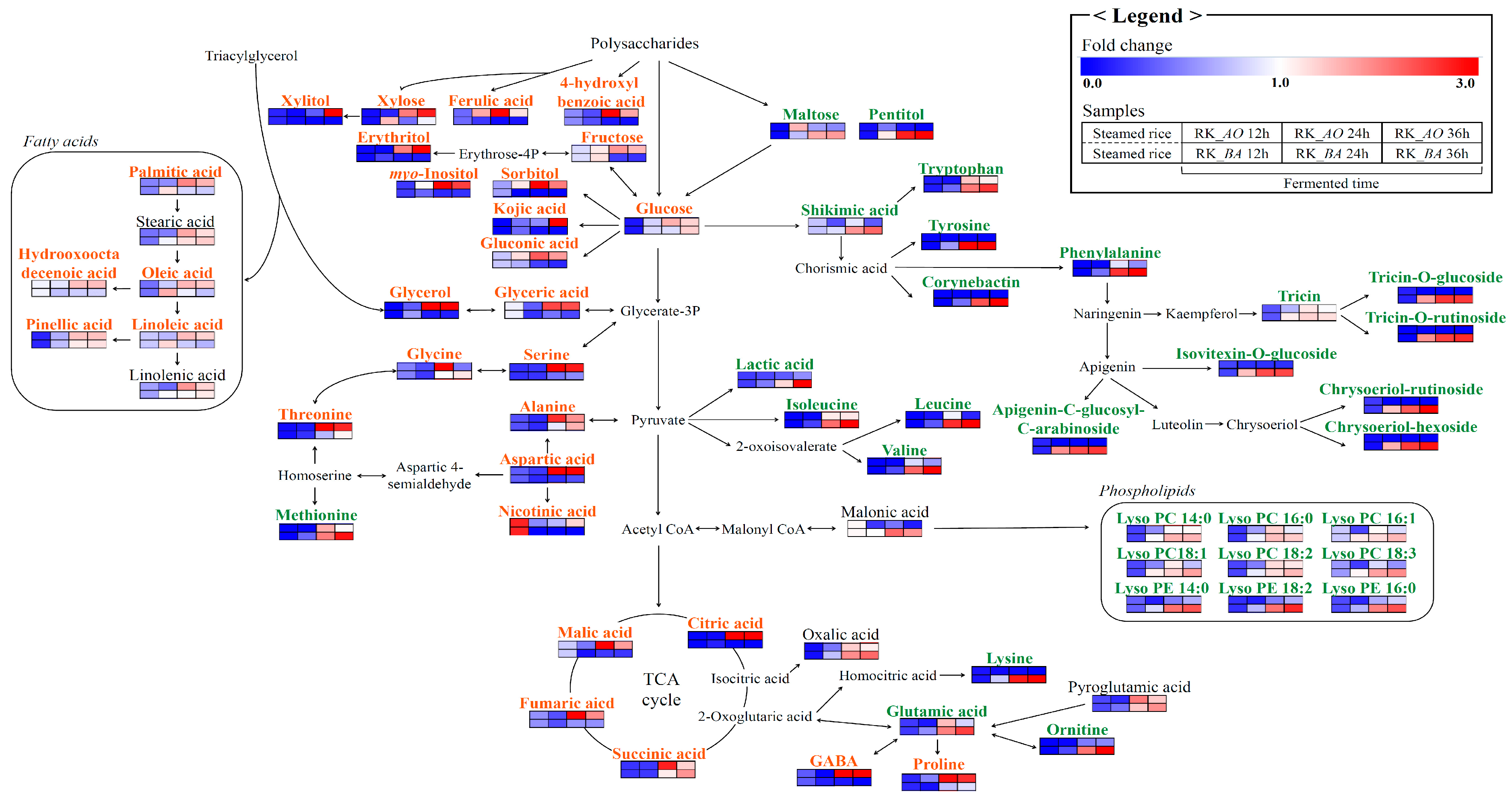 Figure 3 depicts the metabolic pathways shared by the two microbes of interest. Beneath each metabolite, the color on a blue-to-red gradient indicates the mean-normalized relative abundance of each metabolite under each experimental condition, as determined by MS, and metabolites that were significantly different between RK_AO and RK_BA in the OPLS-DA models are shown in orange (RK_AO) and green (RK_BA). Carbohydrate metabolism-related metabolites such as sugars and sugar alcohols (glycerol, erythritol, xylose, xylitol, fructose, glucose, sorbitol, and myo-inositol), organic acids (succinic acid, glyceric acid, fumaric acid, malic acid, kojic acid, citric acid, and gluconic acid), and phenolic acids (4-hydroxybenzoic acid and ferulic acid) were more abundant in the RK_AO samples than they were in RK_BA samples. Related to amino acid metabolism, the aromatic amino acids (AAA; phenylalanine, tyrosine, and tryptophan) derived from shikimic acid and the branched chain amino acids (BCAA; valine, leucine, and isoleucine) were higher in RK_BA, while amino acids related to the serine pathway (alanine, glycine, serine, threonine, and aspartic acid) were higher in RK_AO. The flavonoids (apigenin-C-glucosyl-C-arabinoside, isovitexin-O-glucoside, chrysoeriol-hexoside, chrysoeriol-rutinoside, tricin-7-O-rutinoside, tricin-O-glucoside, and tricin) originated from shikimic acid metabolism and were relatively abundant in RK_BA. In the case of lipid metabolism, the relative content of fatty acids (palmitic acid, linoleic acid, oleic acid, pinellic acid, and hydroxy-oxo-octadecenoic acid) and lysophospholipids (lysoPC (lysophosphatidylcholine) 14:0, LysoPC 18:3, LysoPC 16:1, LysoPC18:2, LysoPC 16:0, LysoPC 18:1, LysoPE (lysophosphatidyl-ethanolamine) 14:0, LysoPE 18:2, and LysoPE16:0) showed opposite trends according to each microorganism.