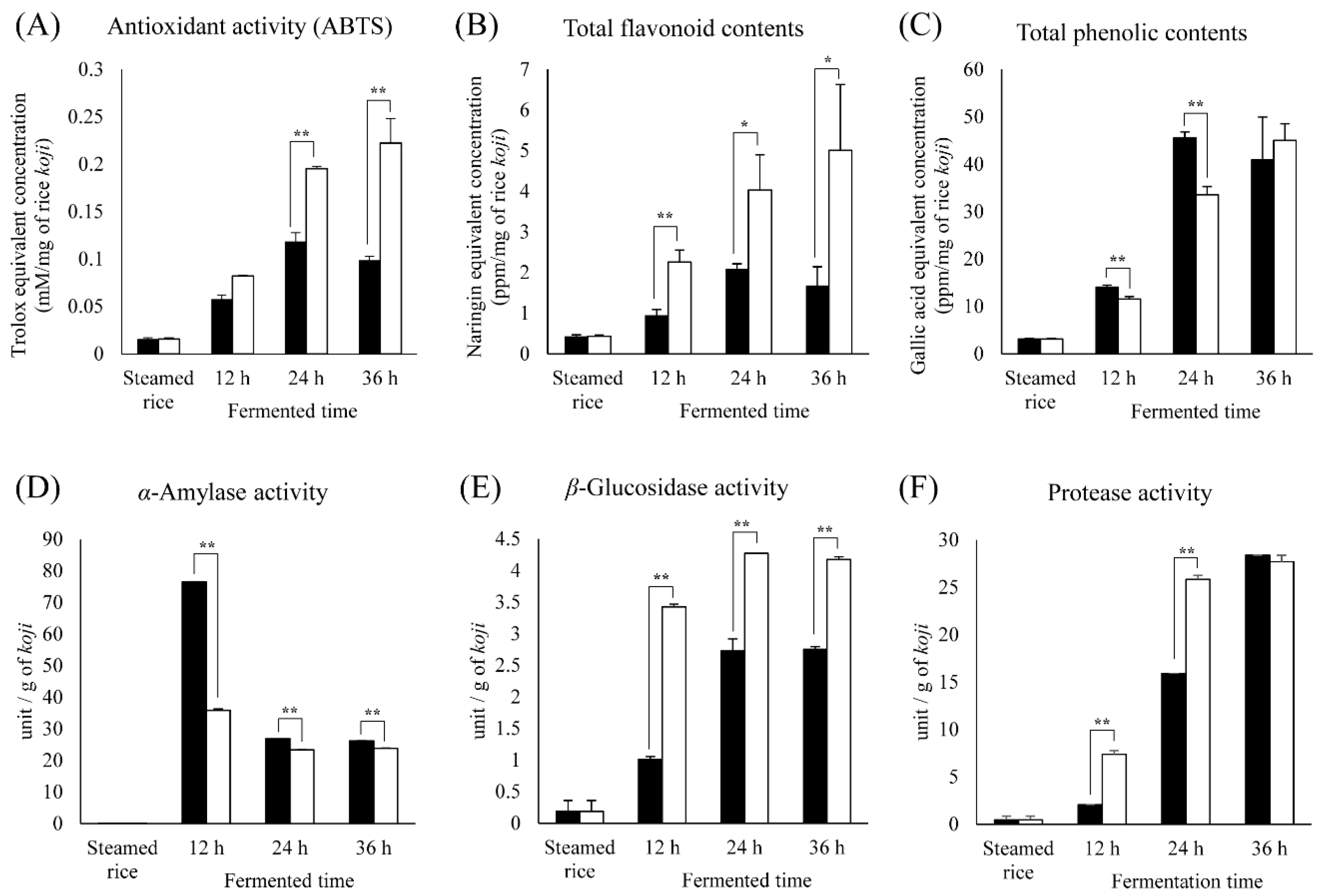 Comparison of bioactivities and enzymatic activities for rice koji fermented with A. oryzae (RK_AO, filled columns) or B. amyloliquefaciens (RK_BA, unfilled columns) for different durations. The bioactivities are antioxidant activity (ABTS) (A); total flavonoid contents (B); and total phenolic contents (C); The enzymatic activities are α-amylase activity (D); β-glucosidase activity (E); and protease activity (F). Significant differences between the RK_AO and RK_BA groups were identified by t-test (* p < 0.05, ** p < 0.01).