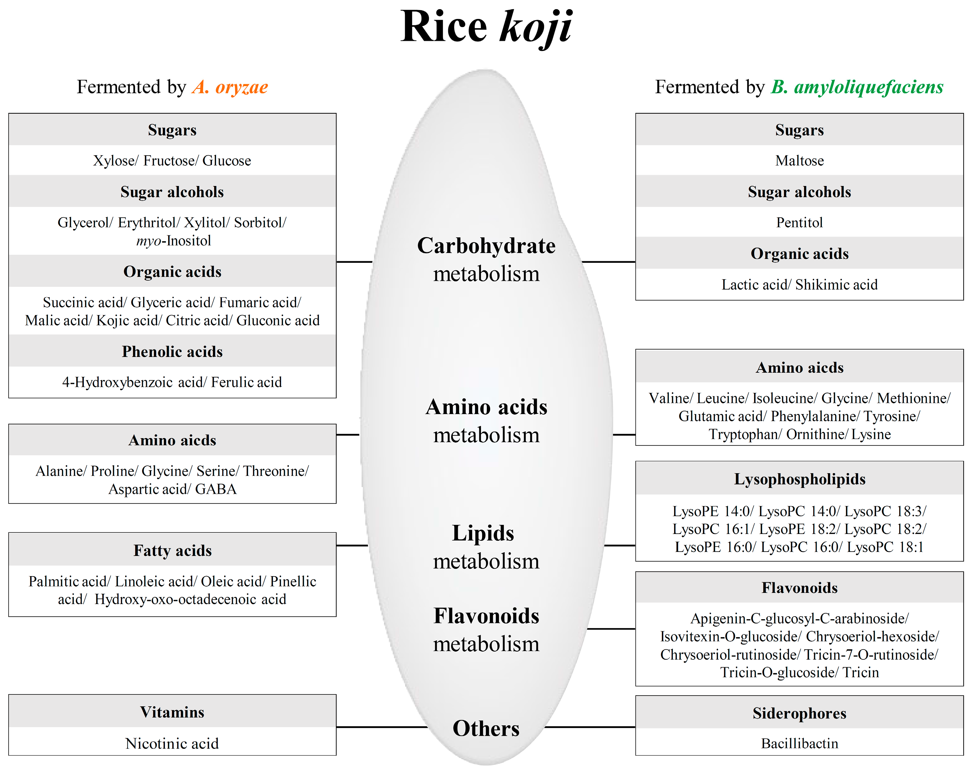 Through mass spectrometry (MS)-based metabolite profiling, we identified differences between the metabolites in rice koji inoculated with a fungus (A. oryzae) and that inoculated with a bacterial species (Bacillus amyloliquefaciens). We also determined differences in the enzymatic and antioxidant activities of the two types of rice koji. Furthermore, we used these observations on metabolism to model microorganism-specific metabolic pathways.