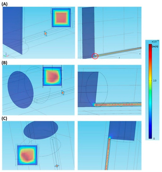 The velocity fields in different inlets at a flow velocity of 0.0001 m/s. (A) The vertical inlet; (B) The parallel inlet; (C) The vertically parallel inlet.