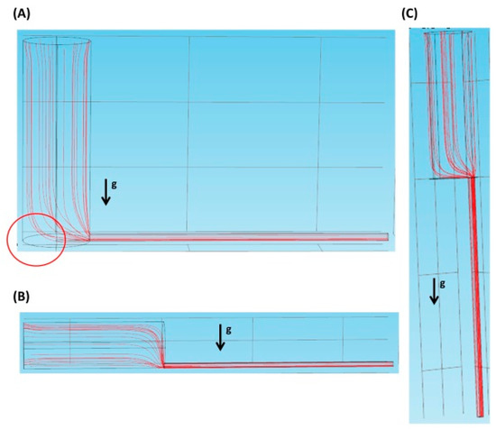 Figure 2A–C show the flow streamlines of the vertical inlet, the parallel inlet, and the vertically parallel inlet, respectively, at a flow velocity of 0.0001 m/s. In Figure 2A, under the effect of gravity, there could be a zero-velocity zone (see the red circle) where cells remain static once they are there. This might in turn result in cell sedimentation. As shown in Figure 2B, gravity could help cells move down and pass through the interface along the flow streamline. In Figure 2C, the direction of gravity and that of flow are the same, so cells could easily enter the microscopic channel with the aid of gravity. Therefore, in the latter two cases, we speculate that very little sedimentation is observed.