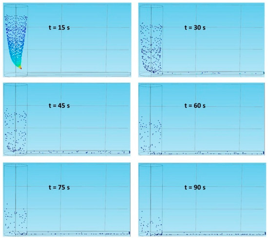 To evaluate how inlet geometry and flow velocity affect cell sedimentation, we inject 1000 cells from the inlet, wait for a suitable time period, and calculate how many cells are collected in the micro-channel outlet. Cell sedimentation refers to cells being captured by the walls of the tubes and the channels. Table 1 lists different flow velocities used in the simulation. Figure 3 shows the particle trajectories in the vertical inlet under the Freeze wall condition at a flow velocity of 0.0001 m/s. At time points of 0, 15, 30, 45, 60, 75, 90, 105, 120, 135, and 150 s, the cell numbers counted are 0, 700, 827, 879, 890, 893, 895, 895, 895, 895, and 895, respectively. Since these numbers reach a plateau after 75 s, the number 890 is selected as the saturation value in the vertical inlet at a flow velocity of 0.0001 m/s. A similar way is used to find the saturated cell number in the outlet under a specified condition.