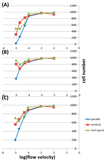 The cell numbers counted in the outlet under different wall conditions and flow velocities in (A) the vertical inlet; (B) the parallel inlet; and (C) the vertically parallel inlet.