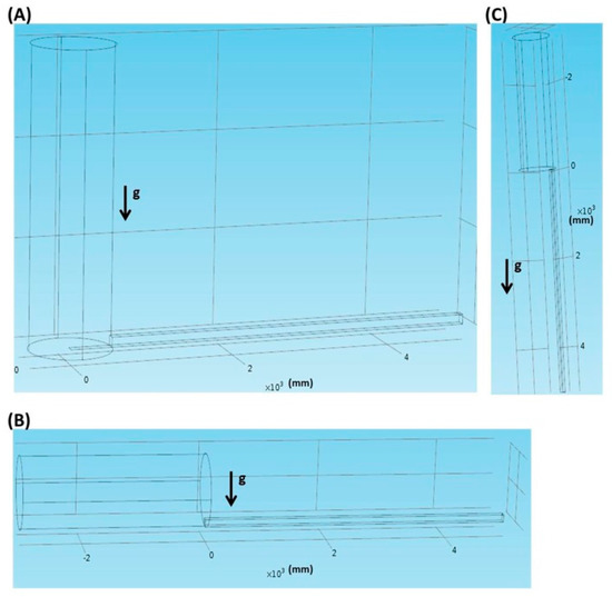 As shown in Figure 6A, in the vertical inlet, the tube is perpendicularly connected, along the direction of gravity, to the fluidic channel. In Figure 6B, in the parallel inlet, the tube is inserted in parallel into the fluidic channel. In the vertically parallel inlet as shown in Figure 6C, the tube is inserted in parallel, along the direction of gravity, into the fluidic channel.
