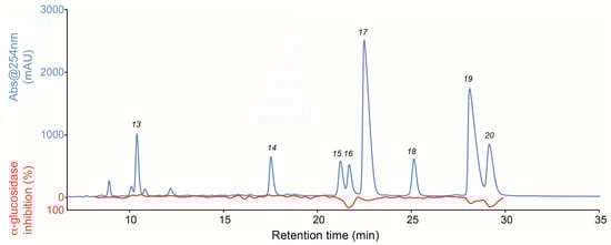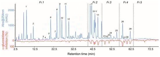 Fraction Fr.2 was submitted to analytical-scale pentafluorophenyl (PFP) HPLC microfractionation, and an α-glucosidase biochomatogram was constructed for identification of α-glucosidase inhibitors. Figure 3 shows the chromatogram at 254 nm (blue line) and the high-resolution α-glucosidase inhibition profile obtained from microfractionation of Fr.2 (red line).