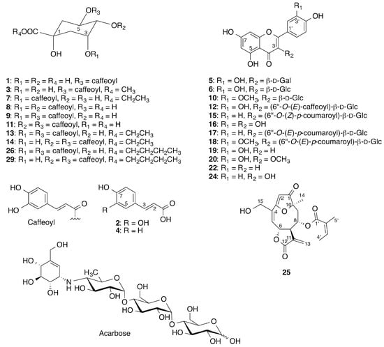 The chromatogram shows several peaks in the range 5–65 min, with satisfactory separation of all major peaks, except in the range from 40 to 48 min. There seems to be minor α-glucosidase inhibitory activity correlated with peaks 11 and 12, but otherwise the majority of peaks correlated with strong α-glucosidase inhibitory activity are observed from 40 to 65 min. For dereplication purposes, the defatted extract was subjected to HPLC-HRMS-SPE-NMR analysis. This led to direct structural identification of 5-O-caffeoylquinic acid (1) [10], caffeic acid (2) [29], quercetin 3-O-β-d-glucoside (6) [10], 3-O-caffeoylquinic acid ethyl ester (7) [30], 3,4-di-O-caffeoylquinic acid (8) [31], 3,5-di-O-caffeoylquinic acid (9) [31], isorhamnetin-3-O-β-d-glucoside (10) [32], 4,5-di-O-caffeoylquinic acid (11) [10], quercetin-3-O-(6″-(E)-O-caffeoyl)-β-D-glucoside (12) [33], apigenin (22) [10], kaempferol (24) [34], centratherin (25) [35], 3,5-di-O-caffeoylquinic acid n-butyl ester (26) [36] and 4,5-di-O-caffeoylquinic acid n-butyl ester (29) [36] (Figure 2) directly from the extract, based on comparison of HRMS and NMR data obtained in the HPLC-HRMS-SPE-NMR mode (Table S1 in Supplementary Materials) with data from literature.