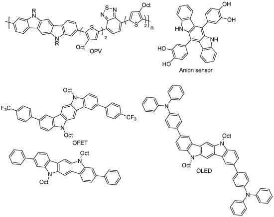 Another interesting application is the use of indolo[3,2-b]carbazole as anion sensor in aqueous environment [] and the biological activity of indolo[3,2-b]carbazole [,,]. In Figure 2, some examples of indolo[3,2-b]carbazoles tested in the above-mentioned applications are given.