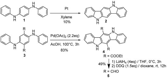 Bergman et al. used palladium acetate as an oxidizing agent to perform a similar ring closure to obtain indolo[3,2-b]carbazole 4 in much higher yield (83%) starting from disubstituted N,N′-diphenyl-p-phenylenediamine 3. The ester groups on indolo[3,2-b]carbazole 4 were further converted to di-aldehyde 5 in very good yield (Scheme 1) [].