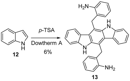 Ishii et al. investigated the oligomerization of indole in acidic conditions. One of the compounds the authors found in the mixture obtained by combining indole 12 with p-toluenesulfonic acid in Dowtherm A (mixture of biphenyl (26.5%) and diphenyl ether (73.5%)) was indolo[3,2-b]carbazole 13, but only 6% yield was obtained under these conditions (Scheme 4) []. The generality of this method was not investigated. Korolev et al. treated 3-formylindole with acid and they detected several indolocarbazoles [].