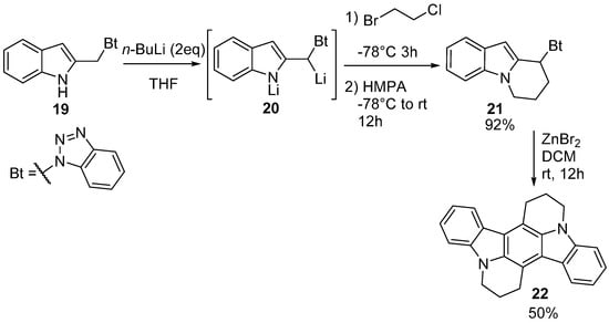 Katritzky et al. prepared indolo[3,2-b]carbazoles starting from 2-[(benzotriazol-1-yl)methyl]indole 19, which was lithiated twice to form intermediate 20 and then C,N-dialkylated with 1-bromo-3-chloro-propane. The resulting tricyclic compound 21 was then converted using ZnBr2 as a catalyst into a cationic intermediate which dimerizes. The intermediate tetrahydroindolocarbazole (not shown) was oxidized with ambient oxygen to obtain the doubly fused indolo[3,2-b]carbazole 22 in 50% yield (Scheme 6) []. This synthesis is based on earlier work by Katritzky et al. in which benzotriazole was also used as a leaving group to perform a coupling reaction between indole and heteroaromatic structures. The overall yield of these reactions is however lower (22% starting from the corresponding benzotriazole compound) [].