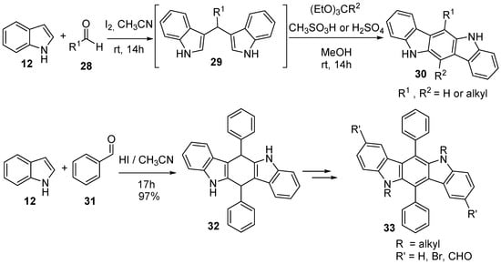 Dehaen et al. developed a strategy to prepare indolo[3,2-b]carbazoles starting from 3,3′-diindolylmethane 29. This diindolylmethane was obtained in situ by Bronsted- or Lewis acid-catalyzed condensation of indole 12 and an aliphatic aldehyde 28. The weak Lewis acid iodine was used in this case. In the second step, an orthoester and a strong Bronsted acid have been used to perform the ring closure (20%–50%). Previous to the ring closure, the 3,3′-connected diindolylmethane rearranged to a 2,3′-connected isomer to ultimately give indolo[3,2-b]carbazole 30 (Scheme 9) [].