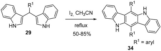 Bhuyan et al. started their synthesis from isolated 3,3′-diindolylmethanes 29. The starting material was dimerized with iodine as a catalyst to achieve a symmetrical indolo[3,2-b]carbazole 34 in 50%–85% yield after 35 min. One equivalent of indole was left unreacted after elimination from the starting material. The final compound is symmetrical because the use of orthoformates is not required. The reaction however does not work with aliphatic and strong electron withdrawing aromatic R groups (Scheme 10) []. Another method by Bhuyan et al. is the three component reaction of indole with an aldehyde and N,N-dimethylbarbituric acid, which affords a 3-alkylindole that can dimerize to a symmetrical indolo[3,2-b]carbazole [].