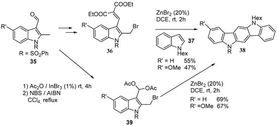 Later, the aldehyde was converted to an acetal as an alternative to the condensation with diethylmalonate. Again, the methyl group was brominated. The obtained bis-electrophile 39 can be condensed with various aryl- and heteroaryl rings to get a polycyclic system. When an N-alkyl-indole 37 was used, in combination with ZnBr2 as a Lewis acid catalyst, indolo[3,2-b]carbazole 38 was formed in 67%–69% yield. The bromide leaving group can also be replaced by an acetate []. The yield is however lower in this case (54%) (Scheme 11).