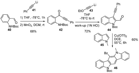 Reddy et al. prepared funtionalized indoles starting from N-Boc protected 2-aminobenzaldehyde 40. Nucleophilic attack of lithiated alkyne 41 and successive oxidation gave compound 42, which was converted by combination with 1-lithio-2-ethoxyethyne 43, acidic deprotection and cyclization to 3-alkynylindole-2-carboxaldehyde 44. This compound was then condensed with 1-methyl-indole 45 in oxidative conditions, using copper(II)triflate, to obtain indolo[3,2-b]carbazole 46 in 60% yield (Scheme 12) [].