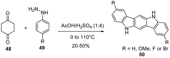 Bergman et al. also exploited the Fischer indole synthesis to prepare functionalized indolo[3,2-b]carbazoles starting from 1,4-cyclohexanedione 48 and functionalized phenylhydrazines 49 (Scheme 14). The indolo[3,2-b]carbazoles 50 were prepared in 20%–50% yield, which is an improvement compared to the other synthesis described in the same paper using functionalized arylamines and Pd(OAc)2 (10%) []. See Ong et al. for extra examples [].