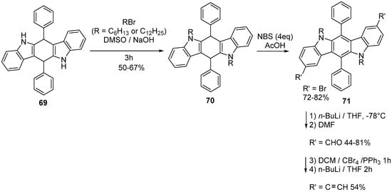 The tetrahydroindolocarbazole 69 which was obtained when benzaldehyde and indole were used for the condensation, has phenyl groups as substituents at both meso position. The compound is however not yet fully aromatic. The tetrahydroindolo[3,2-b]carbazole is first alkylated twice in 50%–67% yield to the more soluble indolo[3,2-b]carbazole 70 and then brominated with an excess of NBS, which at the same time aromatizes the middle ring, to obtain dihydroindolocarbazole 71. These bromine atoms can be converted to aldehydes and further to alkynes (Scheme 20) [].
