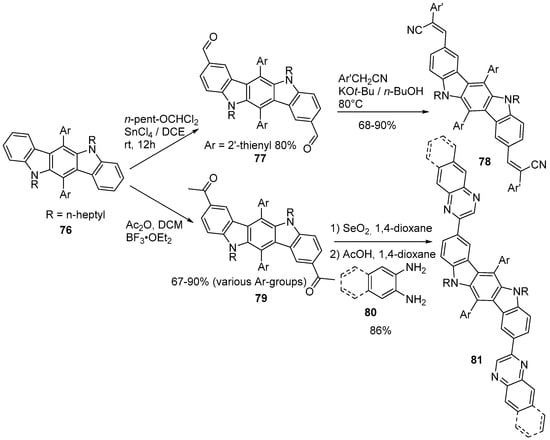 Irgashev et al. developed methods to introduce formyl and acyl groups on the 2- and 8-position of indolo[3,2-b]carbazole 76. The best results for the formylation reaction were obtained by using the “Rieche method”, using SnCl4 and dichloromethylpentyl ether in excess. The di-formylated compound 77 was obtained in 80% yield [].