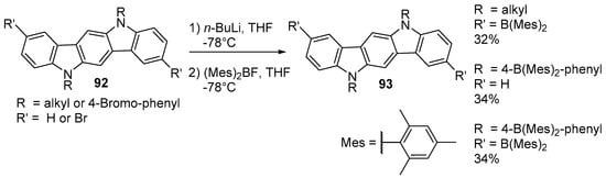Curiel et al. performed the condensation of indole with pyridine-2-carboxaldehyde to obtain indolo[3,2-b]carbazole 86. This indolo[3,2-b]carbazole has then been converted into a complex with triphenylborane to obtain products 87 and 88 (Scheme 24). The maximum absorption peak in DCM shifted from 441 nm (no complexation), over 545 (once complexed) to 643 nm (double complexation) [].