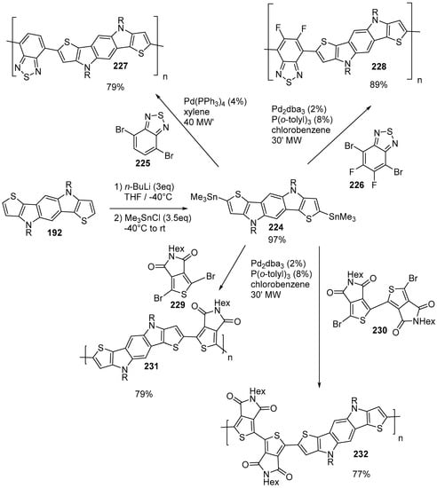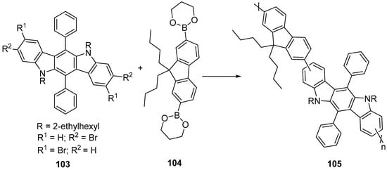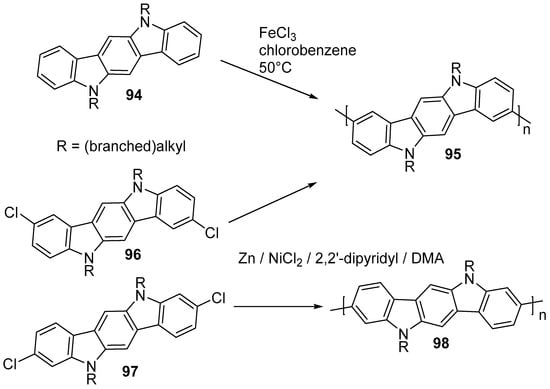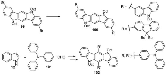 Grazulevicius et al. prepared indolo[3,2-b]carbazole polymers to be used as hole transporting materials and as emitting layer in OLEDs. The active material was prepared by alkylation of nitrogen and Buchwald–Hartwig amination of dibrominated indolo[3,2-b]carbazole 72 to prepare indolo[3,2-b]carbazole 73 which then was polymerized with acid catalysts.