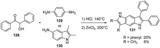 Ivonin and coworkers used indole and phenylglyoxal to prepare 2-hydroxy-2-indol-3-yl-acetophenone 26, which was then heated up to 200 °C. When the non-alkylated indole is used, only 10% of the dibenzoylated indolo[3,2-b]carbazole 27 is obtained. By using N-methylated indole for this reaction, the yield is increased up to 91% (Scheme 8) [].