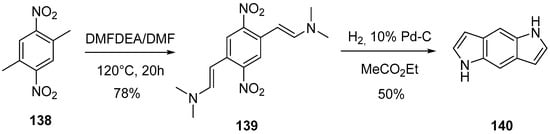 - Berlin, A.; Ferraccioli, R.; Pagani, A.; Sannicolo, F. Expeditious synthesis of Dihydrobenzo-[2,1-b:3,4-b’]-, [1,2-b:5,4-b’], and [1,2-b:4,5-b’]-dipyrroles. J. Chem Soc. Chem. Commun. 1987, 1176–1177. [Google Scholar] [CrossRef]