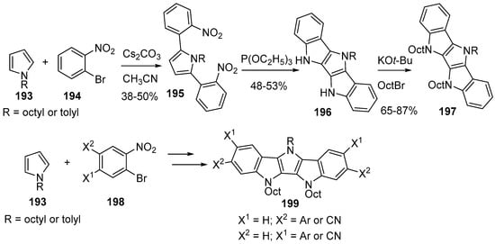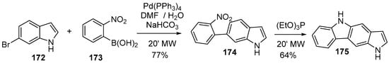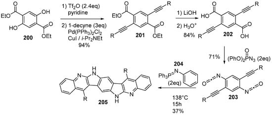 Wrobel et al. exploited a microwave assisted Cadogan ring closure on terphenyl 55 to obtain 6,12-dialkoxy-indolo[3,2-b]carbazole 56 in reasonable yield (Scheme 16) [].