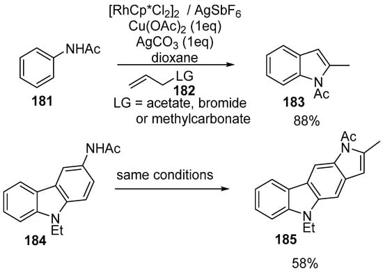 - Gong, T.J.; Cheng, W.M.; Su, W.; Xiao, B.; Fu, Y. Synthesis of indoles through Rh(III)-catalyzed C-H cross-coupling with allyl carbonates. Tetrahedron Lett. 2014, 55, 1859–1862. [Google Scholar] [CrossRef]