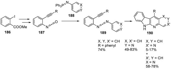 - Katritzky, A.R.; Xie, L. A general and facile synthesis of heterocyclo[b]-fused carbazoles. J. Org. Chem. 1995, 60, 3707–3710. [Google Scholar] [CrossRef]