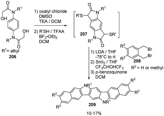 - Levick, M.T.; Grace, I.; Dai, S.-Y.; Kasch, N.; Muryn, C.; Lambert, C.; Turner, M.L.; Procter, D.J. A Sm(II)-Mediated cascade approach to dibenzoindolo[3,2-b]carbazoles: Synthesis and evaluation. Org. Lett. 2014, 16, 2292–2295. [Google Scholar] [CrossRef] [PubMed]