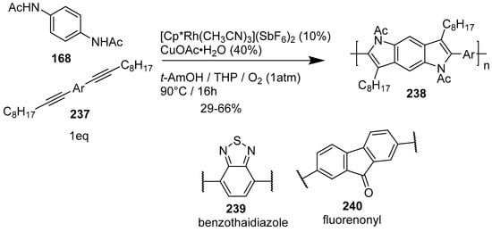 - Tokoro, Y.; Sato, H.; Fukuzawa, S. Synthesis of π-conjugated polymers containing benzodipyrrole moieties in the main chain through cleavage of C-H bonds in 1,4-bis(acetylamino)benzene. ACS Macro Lett. 2015, 4, 689–692. [Google Scholar] [CrossRef]