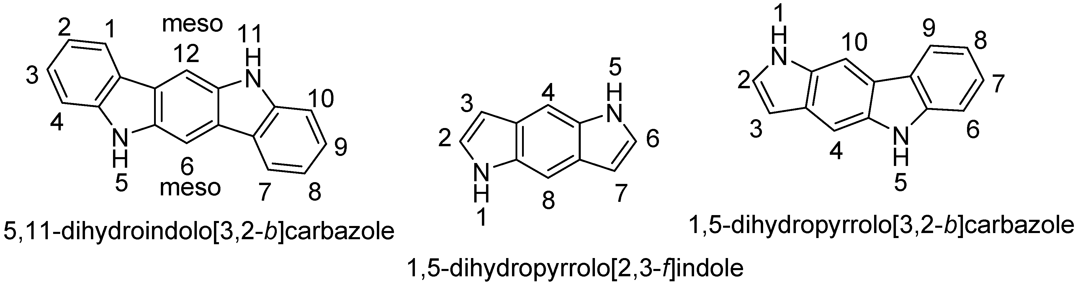 Structure of indolo[3,2-b]carbazole, pyrrolo[2,3-f]indole and pyrrolo[3,2-b]carbazole.
