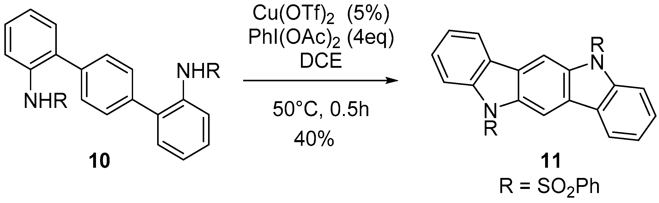 PhI(OAc)2 was shown to be the stoichiometric oxidant with the best results for the carbazole synthesis. Copper triflate was used as a catalyst and this improved the yield of the reaction going from 75% up to 93%. The optimized reaction conditions (for carbazole) were used on 2,2″-bis(sulfonamide)-p-terphenyl 10 to afford indolo[3,2-b]carbazole 11 in 40% yield after a double cyclization (Scheme 3) [23].