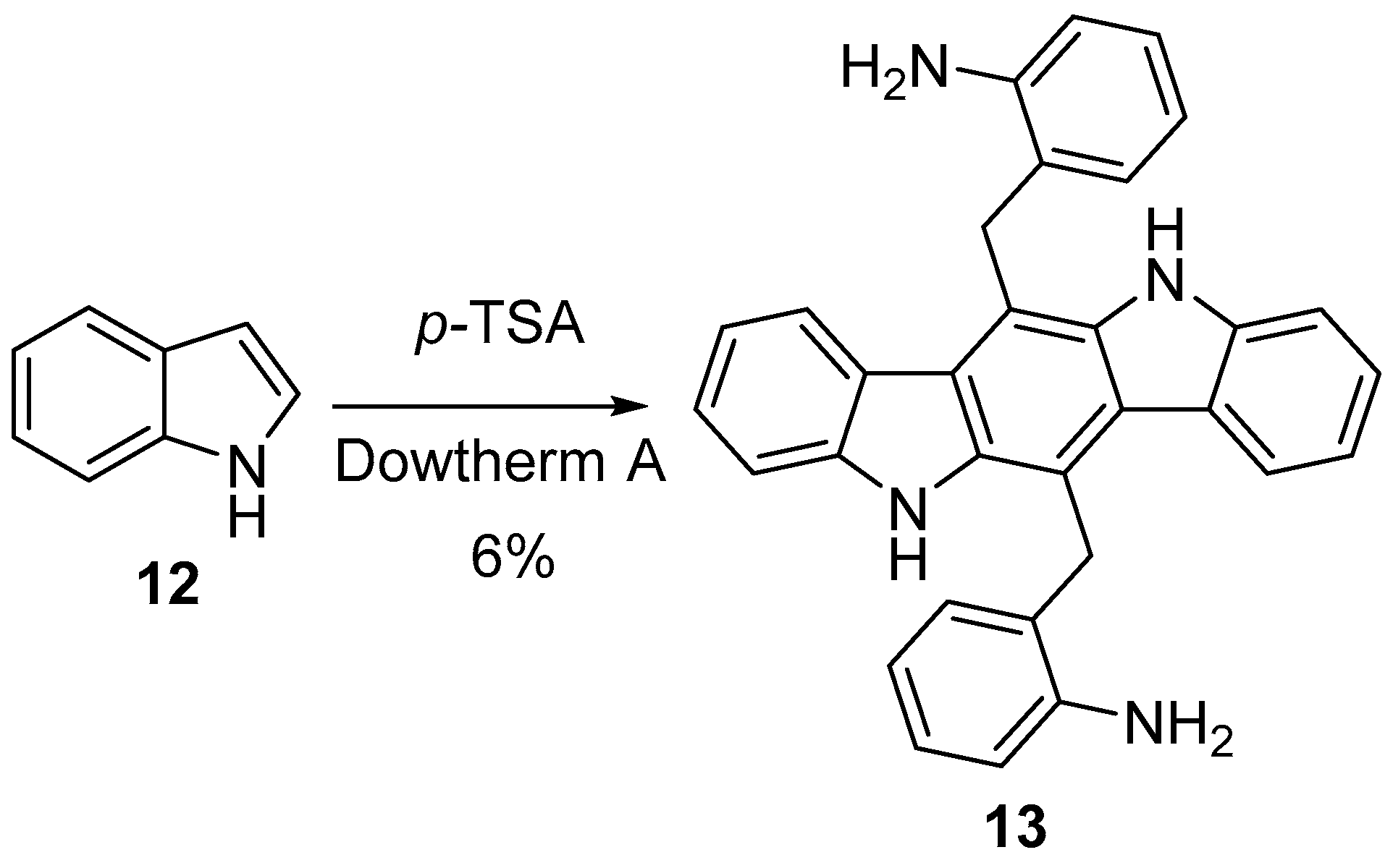 Ishii et al. investigated the oligomerization of indole in acidic conditions. One of the compounds the authors found in the mixture obtained by combining indole 12 with p-toluenesulfonic acid in Dowtherm A (mixture of biphenyl (26.5%) and diphenyl ether (73.5%)) was indolo[3,2-b]carbazole 13, but only 6% yield was obtained under these conditions (Scheme 4) [24]. The generality of this method was not investigated. Korolev et al. treated 3-formylindole with acid and they detected several indolocarbazoles [25].