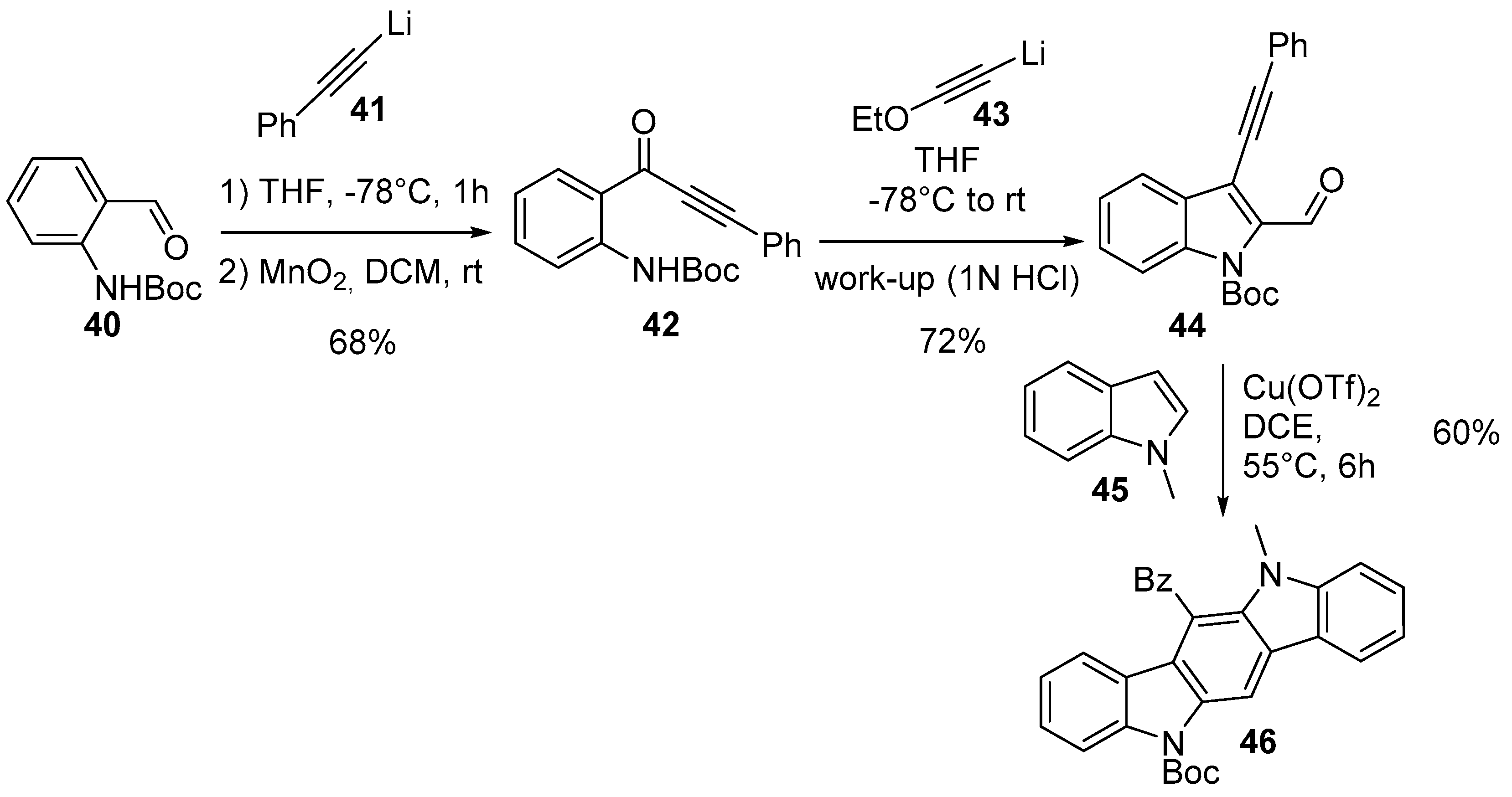 Reddy et al. prepared funtionalized indoles starting from N-Boc protected 2-aminobenzaldehyde 40. Nucleophilic attack of lithiated alkyne 41 and successive oxidation gave compound 42, which was converted by combination with 1-lithio-2-ethoxyethyne 43, acidic deprotection and cyclization to 3-alkynylindole-2-carboxaldehyde 44. This compound was then condensed with 1-methyl-indole 45 in oxidative conditions, using copper(II)triflate, to obtain indolo[3,2-b]carbazole 46 in 60% yield (Scheme 12) [37].